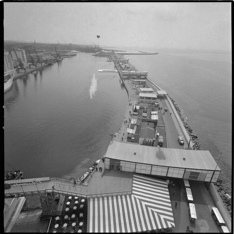 Bilden föreställer Parapeten i fågelperspektiv. I förgrunden gångbro. Till vänster hamn och till höger hav.
