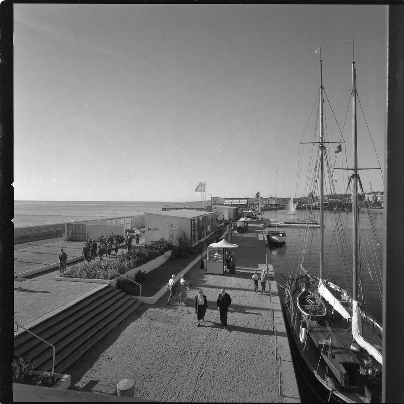 Bilden föreställer en överblick över en bit av Parapeten med byggnader, gångbanor och planteringar samt en trappa. Till vänster hamn med del av båt i bakgrunden hav.