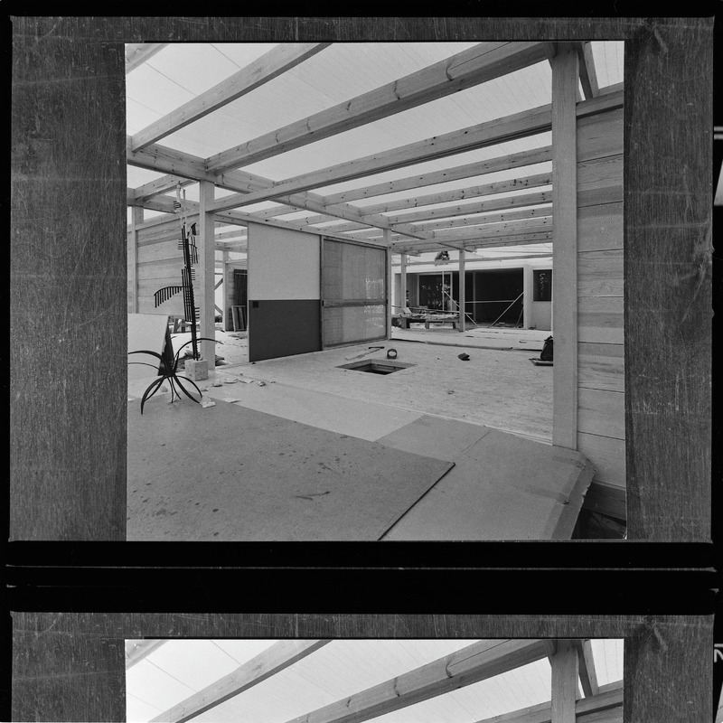 Bilden föreställer paviljong under uppbyggnad. Man ser in i ett utrymme där golvet endast har reglar. Väggarna är inte heller helt klara.