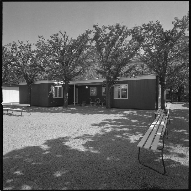 Bilden föreställer en öppen yta med bänkat vid sidorna. I bakgrunden ett enplanshus omgivet av träd och med trädgårdsmöbler.