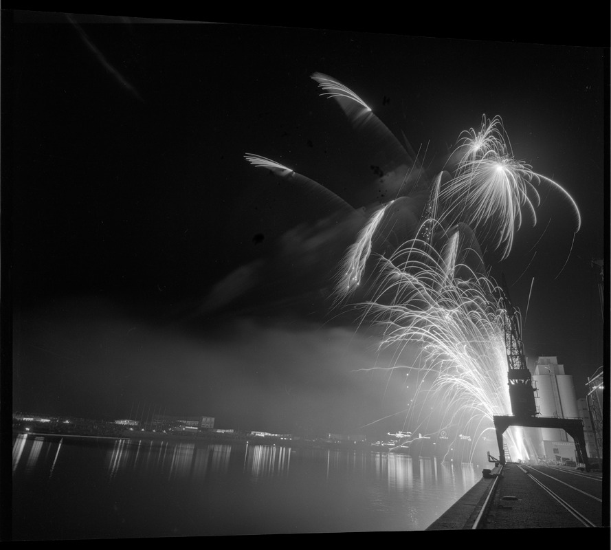 Bilden föreställer fyrverkeri på himlen över hamnen. I bakgrunden Parapeten.