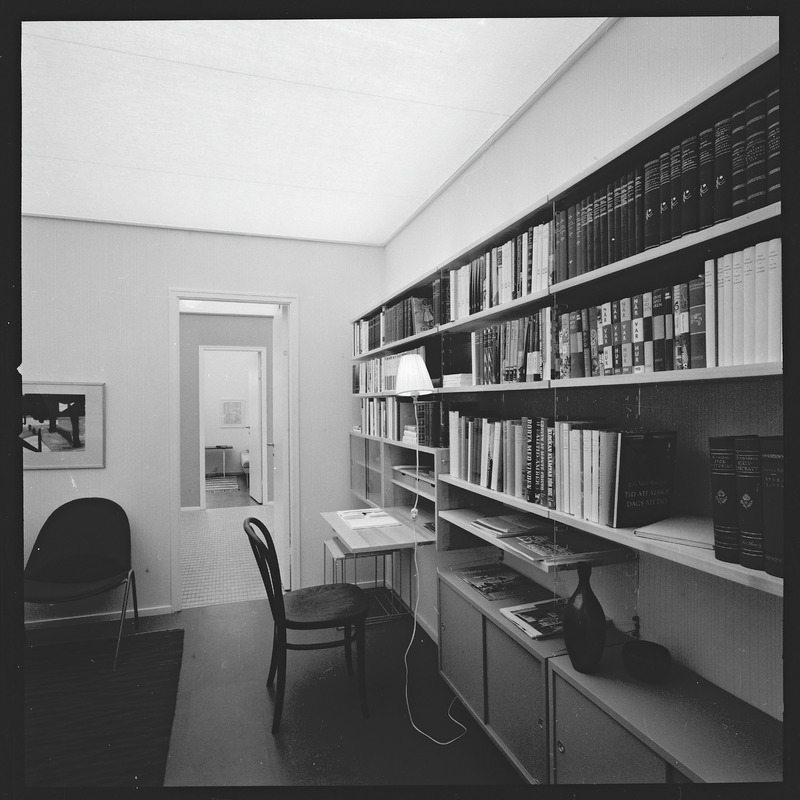 Bilden föreställer långsidan i ett vardagsrum med bokhylla utmed hela. Där står också en stol.