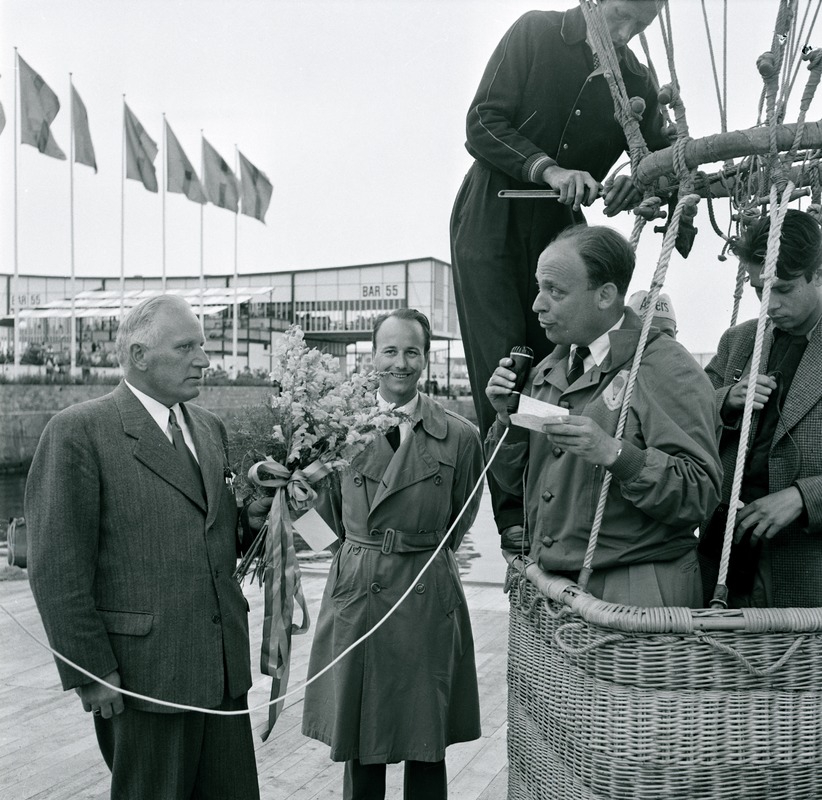 Bilden föreställer en del av korgen till en luftballong. I korgen står en man och talar i mokrofon. Där är två personer till i korgen och två personer står utanför och håller i en blomsterbukett. I bakgrunden flaggor och en paviljong.