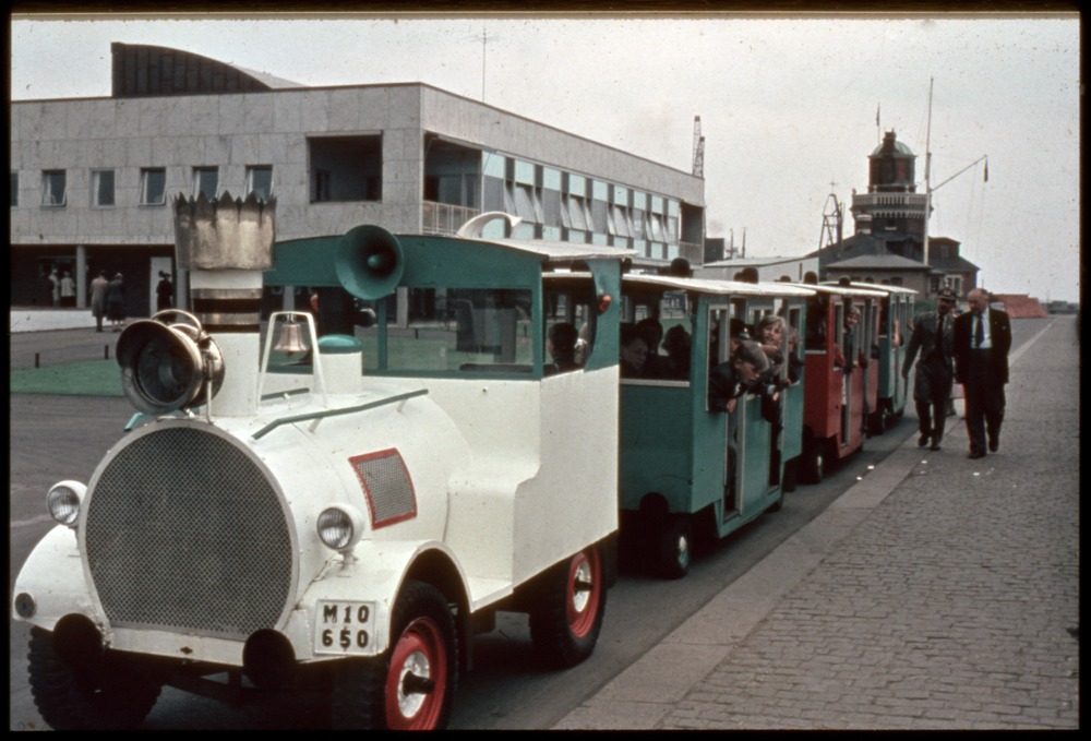 Bilden föreställer ett lok med efterföljande vagnar. I bakgrunden paviljong och fyr.