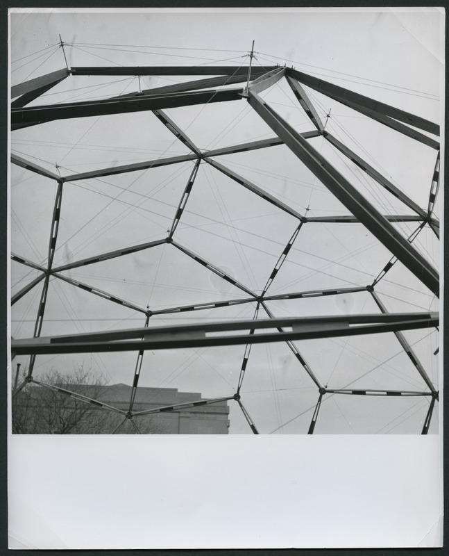 Bilden föreställer delar av "Geodesie Structure" designad och uppfunnen av R Buckminster Fuller, USA. Del av en öppenkonstruktion av metallskenor som monteras i kvadrater, rektanglar, romber. I bakgrunden himmel.