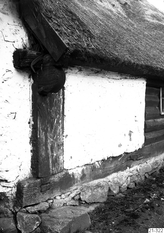 "Detalj av sammanhuggning av bjälkar och ståndare i stuglängan"