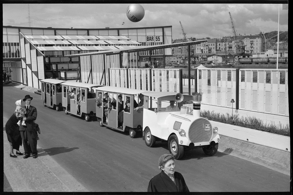 Bilden föreställer en gångbana där det kommer ett litet tåg rullande, där är också besökare. I bakgrunden ett staket och en byggnad, samt bebyggelse.