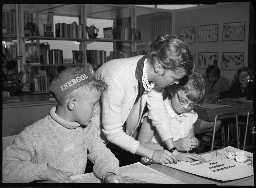 Bilden föreställer i förgrunden en kvinna och två barn som sitter vid ett bord med något pussel. I bakgrunden en bokhylla. Till jhöger skolbänkar där det sitter två personer och på väggen bakom tavlor med växtmotiv.