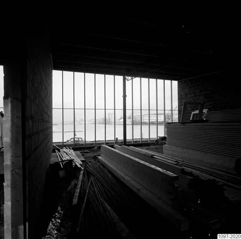 Bilden föreställer ett rum under uppbyggnad i en paviljong. Glasfasad i bakgrunden.
