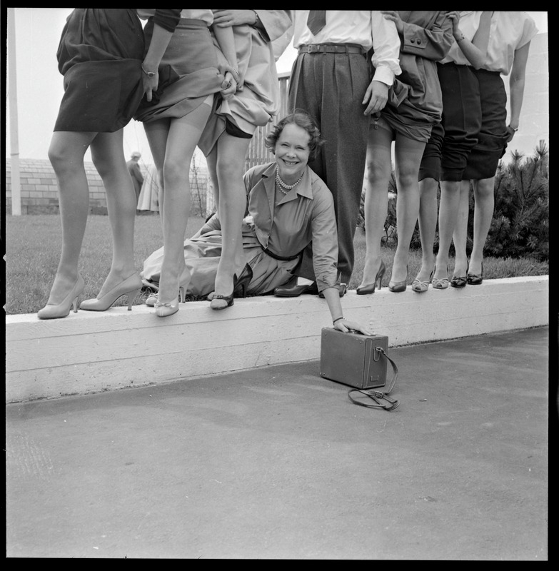 Bilden föreställer kvinnors ben nedanför midjan med korta kjolar och med skor gåendes på en låg mur. En kvinna sitter på huk och håller i en apparat. Mitt bland kvinnorna står en man i långbyxor.