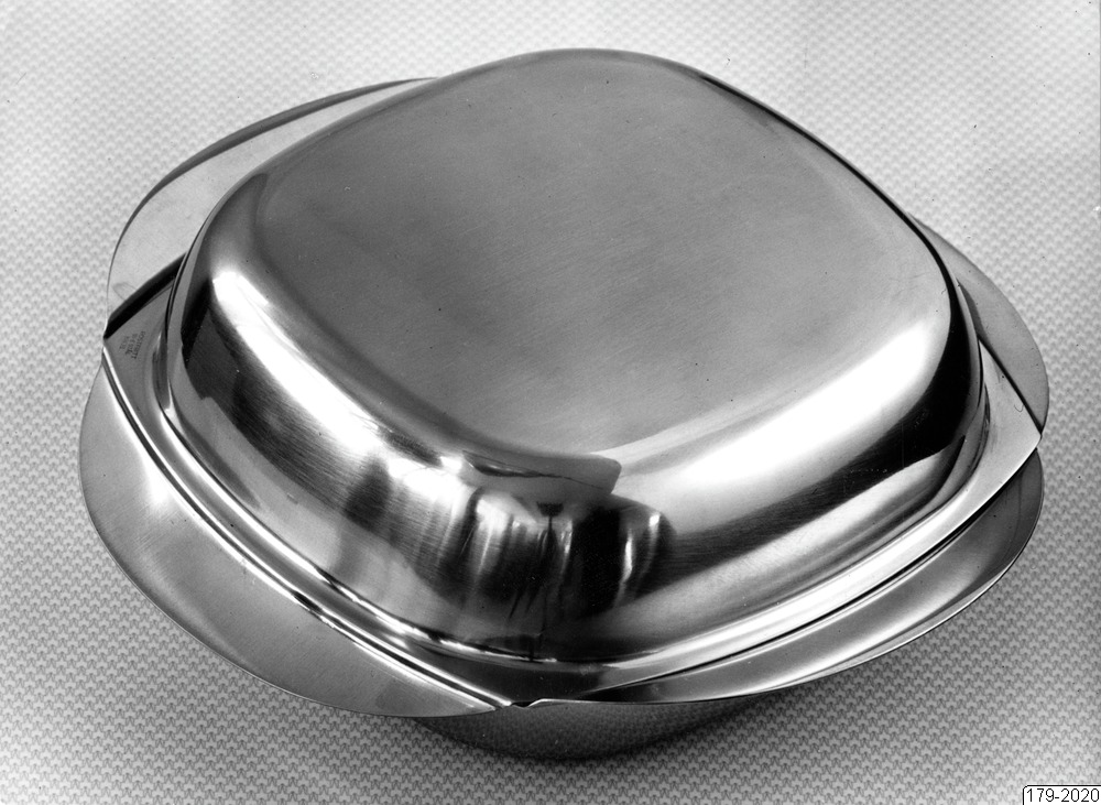 Bilden föreställer servisdelar Global. Formgivare: Ädelsmeden Sigurd Persson. Material: rostfritt kromnickelstål 18-8. Fotot visar: dubbelkarott, även användbar som två enkelkarotter. (Kooperativa Förbundet Stockholm)