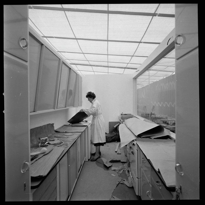 Bilden föreställer ett rum som håller på att inredas. Där finns skåp och lådor, skall detta bli ett kök? I bakgrunden står en kvinna.
