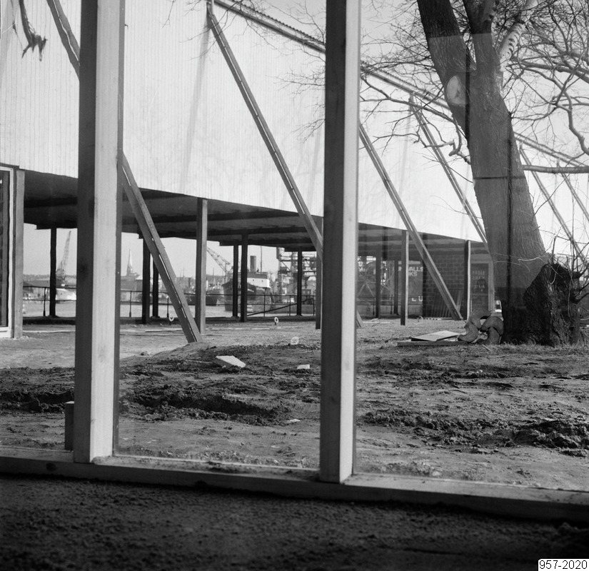 Bilden föreställer i förgrundenpelarer, till vänster en trädstam. I bakgrunden en paviljong med öppen undervåning och inbyggt andraplan.