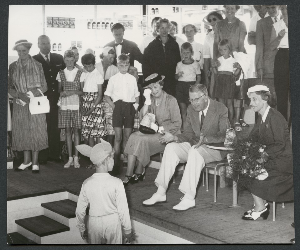 Bilden föreställer kungaparet drottning Louise och Gustav VI Adolf på barnteater i avdelning "Leka och Lära". Kungaparet är omgivna av andra åskådare vuxna och barn.
