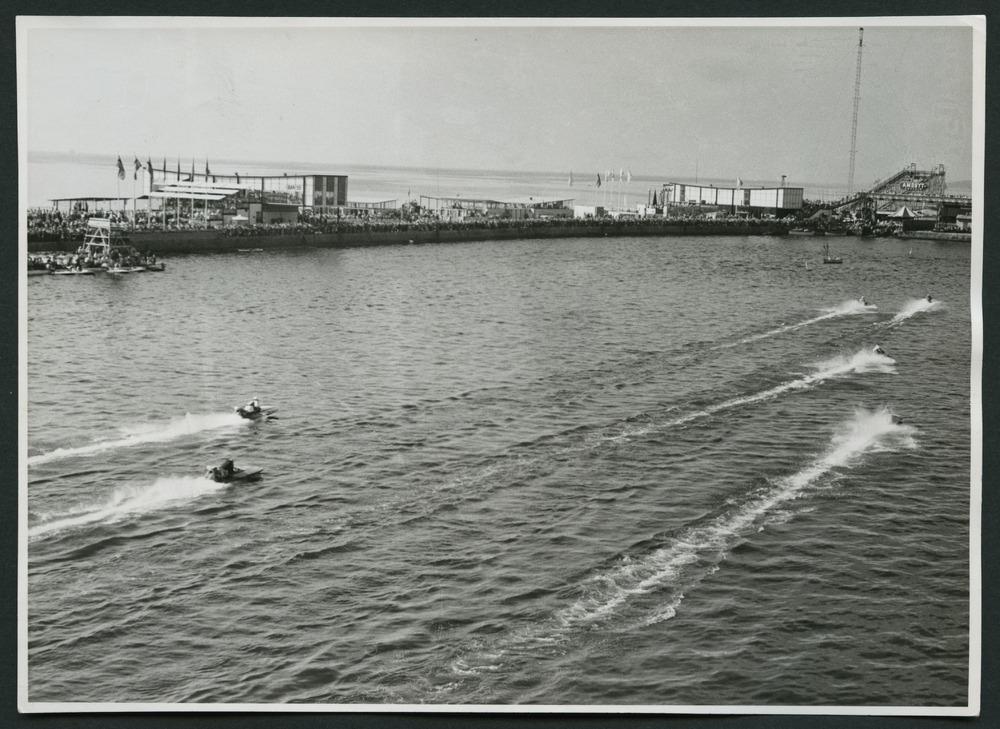 Bilden föreställer motorbåtstävling i norra hamnen. I förgrunden hamn med sex motorbåtar. I bakgrunden pir och hav.