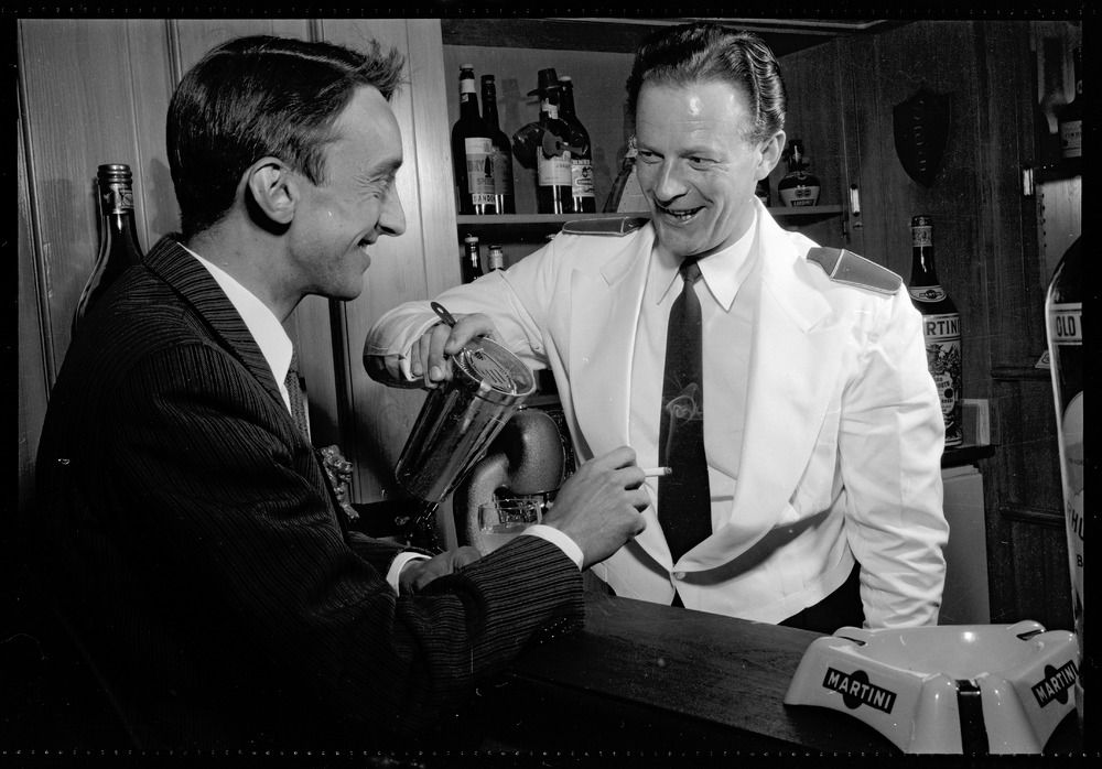 Bilden föreställer två män i halvfigur stående vid en bardisk. En man röker den andra serverar en dryck. I bakgrunden spritflaskor.