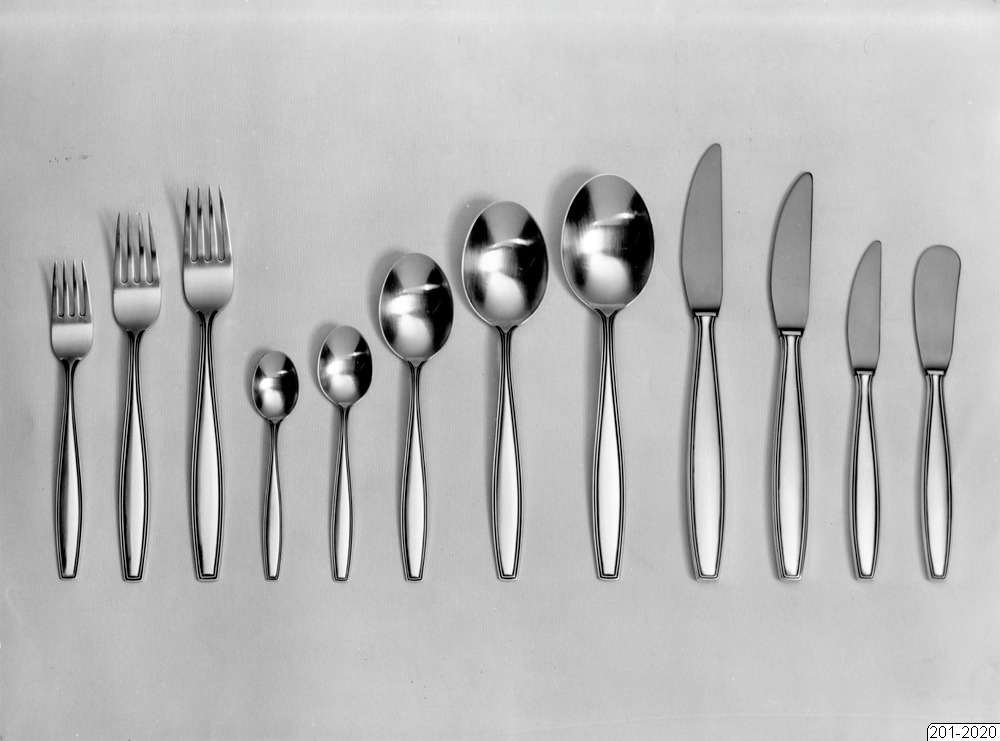 Bilden föreställer Matbestick i rostfritt stål. Komposition: Sven-Arne Gillgren. Guldsmedaktiebolaget i Stockholm, G.A.B. Tre gafflar, fem skedar, fyra knivar allt i olika storlek.