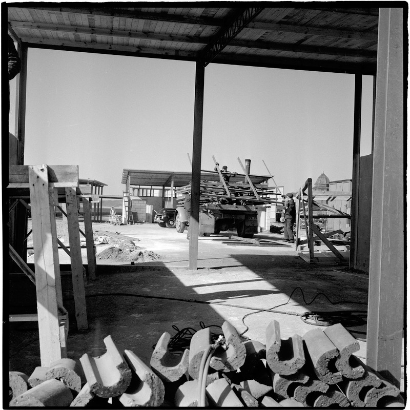Bilden föreställer paviljonger under uppbyggnad. I förgunden byggnadsmaterial (tegelpannor?) under ett tak och med en öppen fasad. I bakgrunden ytterligare byggnadsarbete.