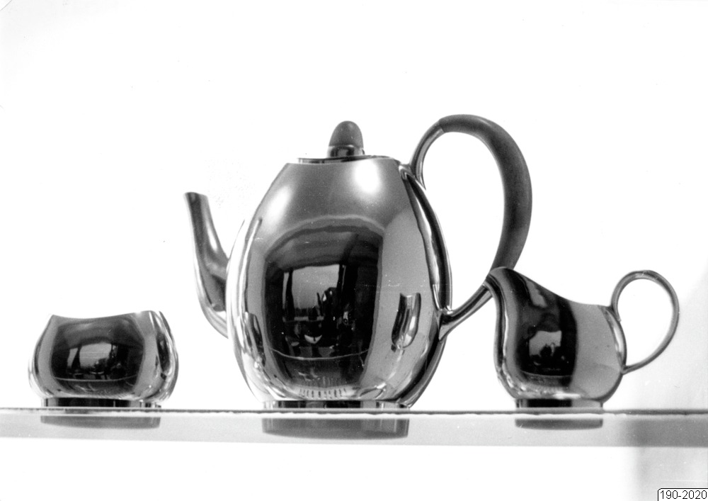 Bilden föreställer silver i Svenska konstindustrihallen. En stor kanna en liten kanna och en skål.