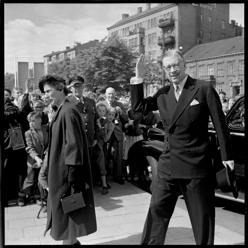 Bilden föreställer en man och en kvinna som troligen stigit ur en bil. I bakgrunden folksamling och byggnader.