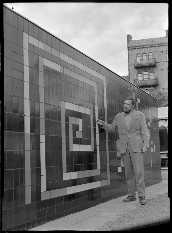 Bilden föreställer en kaklad vägg med ett geometriskt mönster. Vid konstverket står en man och pekar på det.