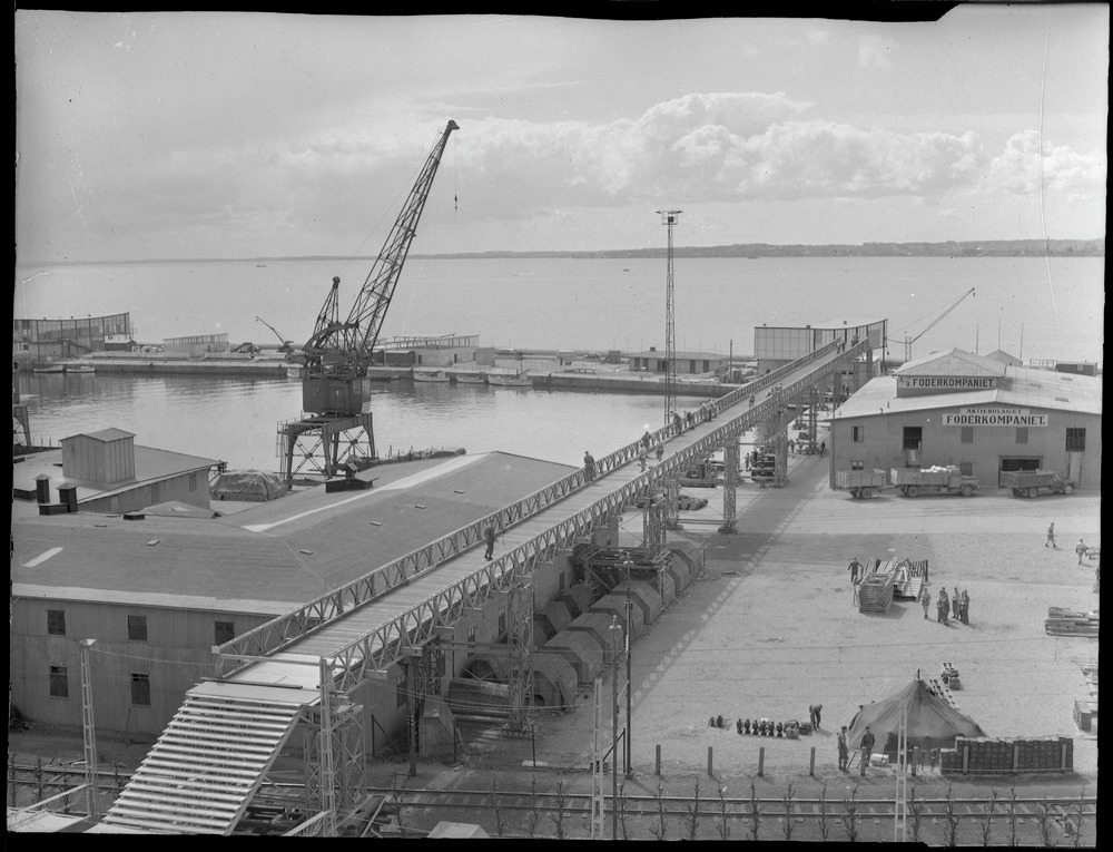 Bilden föreställer en bro iform av en metallkostruktion. I bakgrunden undertill byggnader, samt hamn, lyftkran och pir. Till höger byggnad med skylten Aktiebolaget Foderkompaniet.