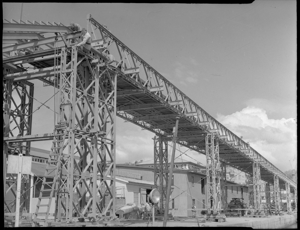 Bilden föreställer en bro iform av en metallkostruktion. I bakgrunden undertill byggnader.