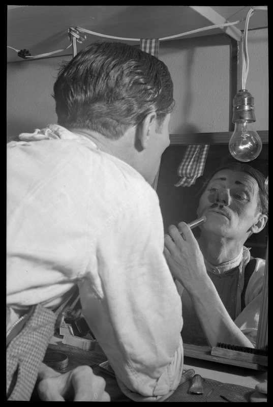 Bilden föreställer en man i bröstformat som håller på att sminka sig framför en spegel.