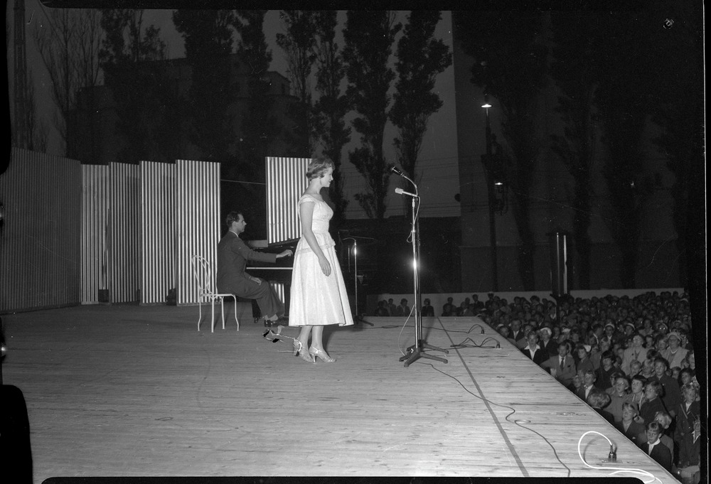 Bilden föreställer en scen med en kvinna framför en mikrofon och bakom henne en man vid en flygel. Till höger publik.