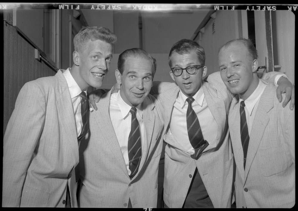 Bilden föreställer fyra män fotograferade i halvformat. Männen har likadana skjortor, kavajer och slipsar. (troligen orkestern på bild 3556-2020)
