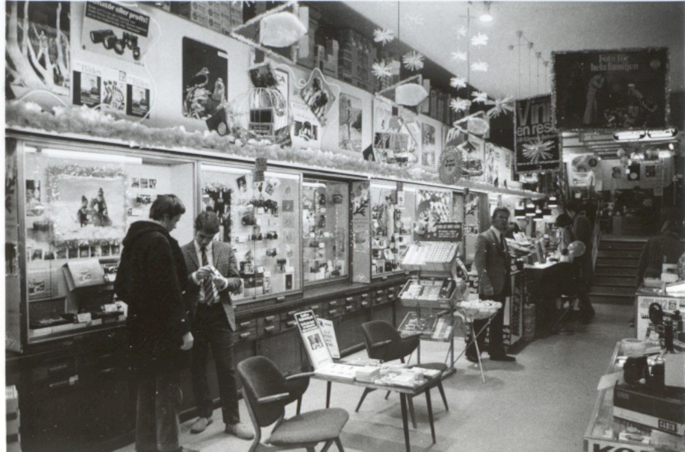Fotografi som avbildar Hefomas affär på Järnvägsgatan 3, här ser vi kamera avdelningen dekorerad med juldekorationer, kassan kan ses i bakgrunden före trappan. Tagen efter ombyggnaden av affären 1957-58, troligen på 60-talet.