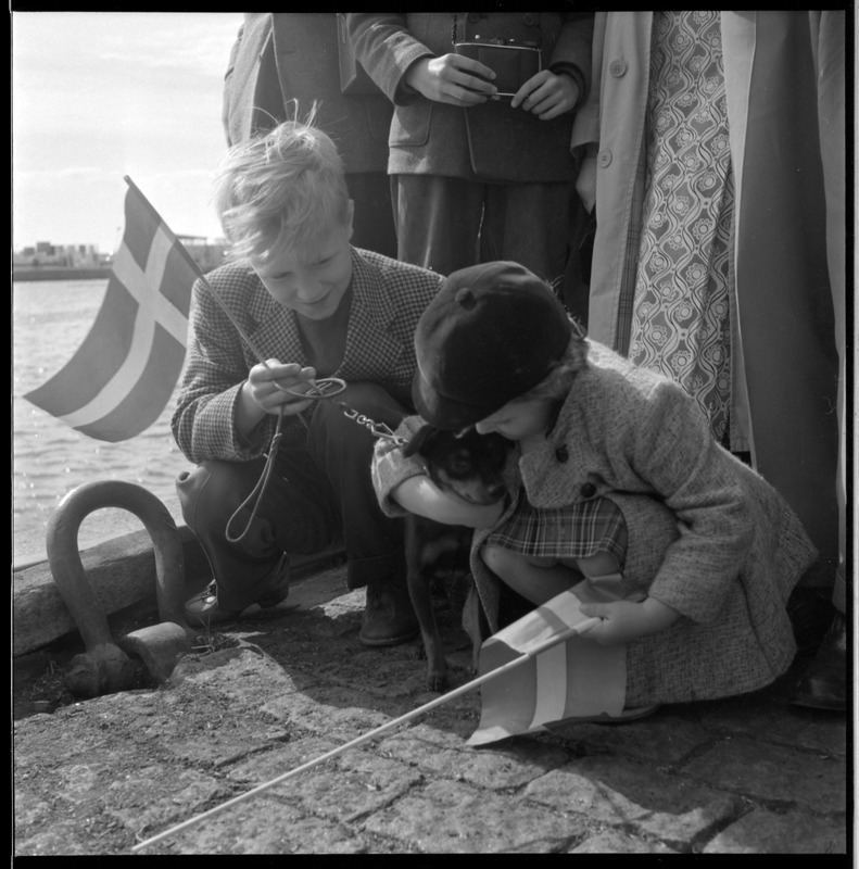Bilden föreställer två barn som sitter på huk med varsin flagga i händerna. Bakom dem del av person.