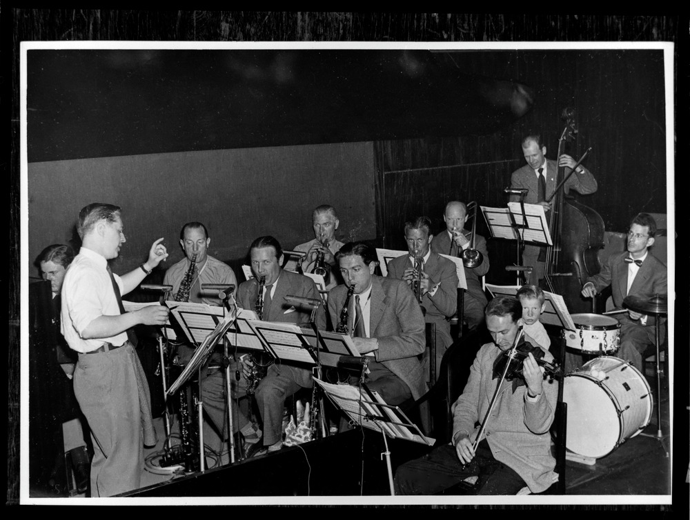 Bilden föreställer en orkester med dirigent. Där finns trumslagare olika blåsinstrument, en violinist och en bas. Alla har notställ.