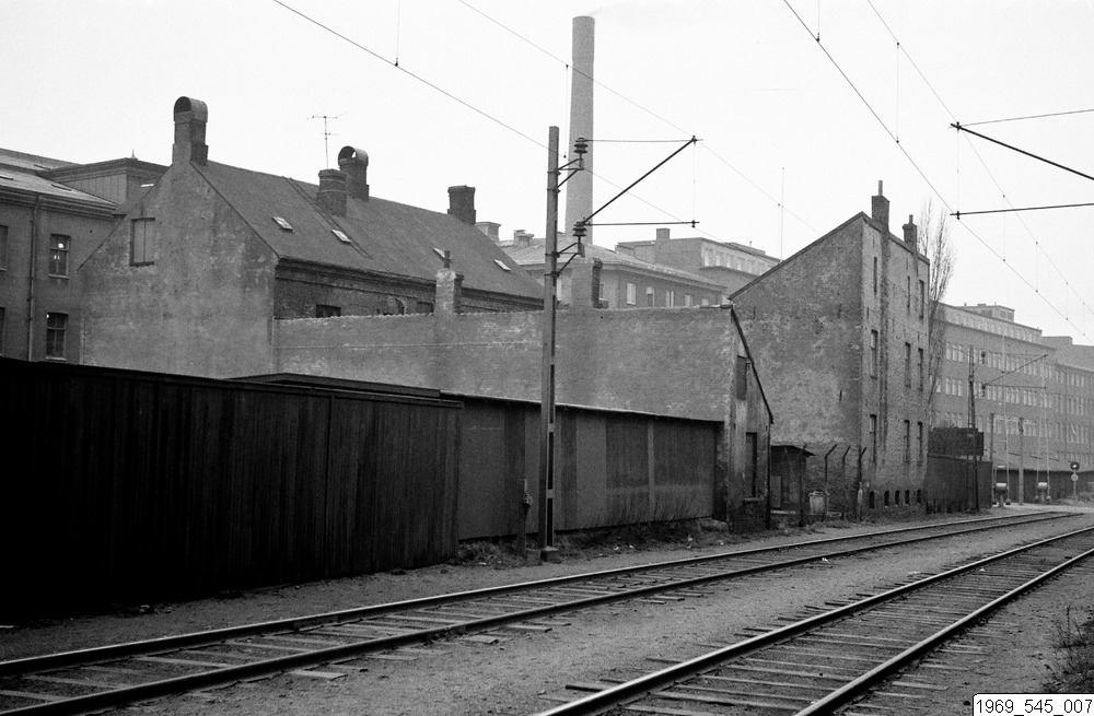 Järnvägsövergång vid Furutorpsgatan, gummifabriken i bakgrunden.