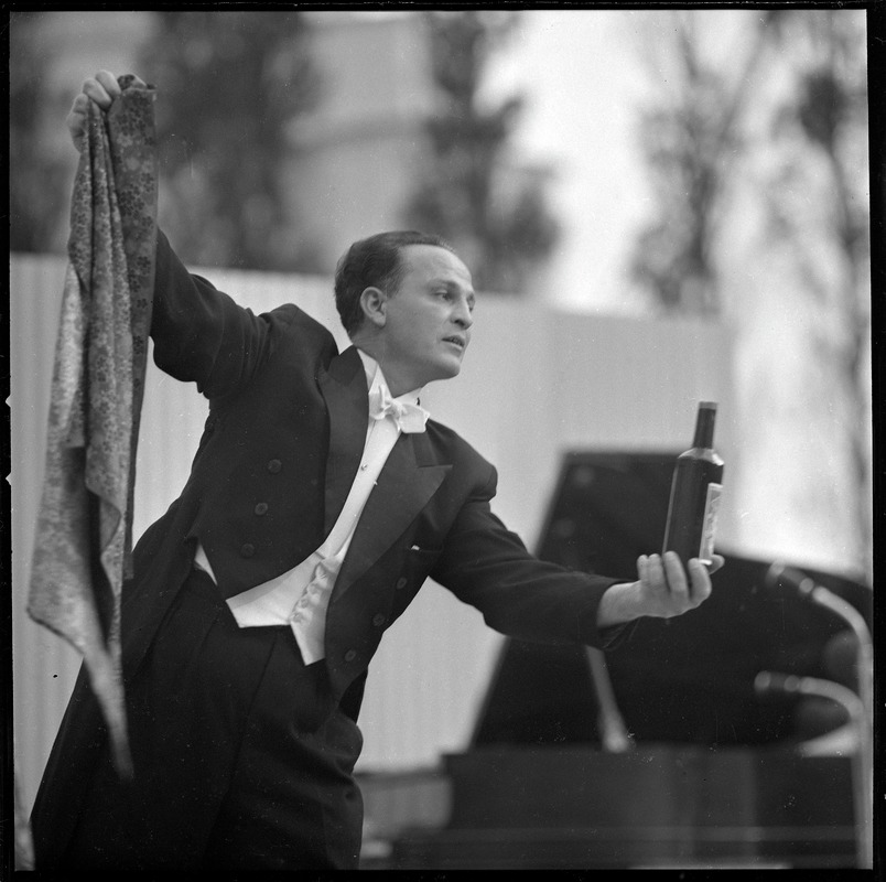 Bilden föreställer en trollkarl på en scen. Han håller i en flaska och en näsduk.