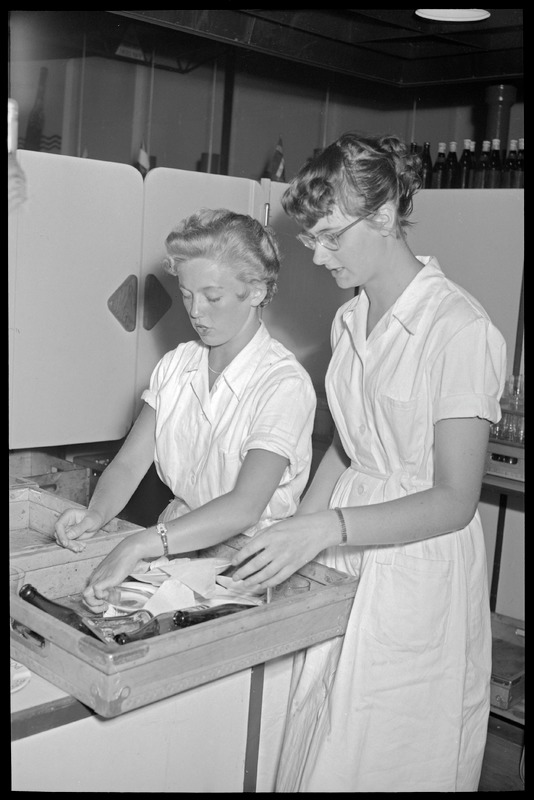 Bilden föreställer två kvinnor i halvfigur med köksklädsel i ett diskutrymme på en restaurang. De står vid två brickor med flaskor och servetter.