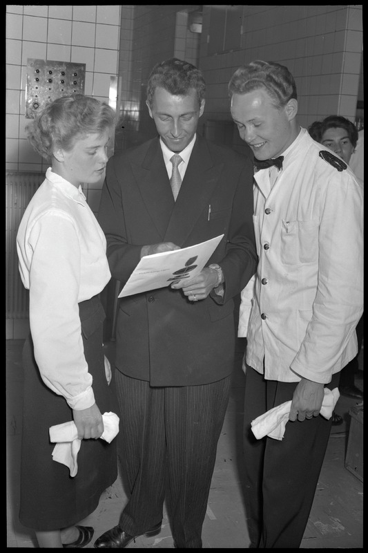 Bilden föreställer två män och en kvinna i kostym respektive serveringsklädsel. En man håller i en matsedel de andra två har varsin servette i handen.