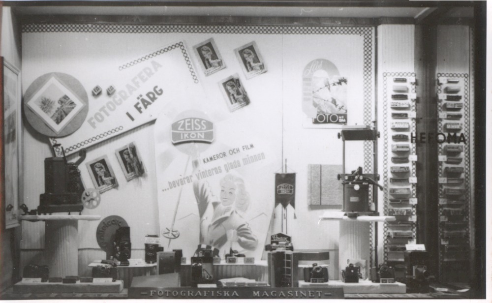 Fotografi som avbildar ett skyltfönster i Hefomas affär på Järnvägsgatan 3, i fönstret ser vi reklam för Zeiss Ikon kameror. Bilden är troligen tagen på 1940 eller 1950-talet.