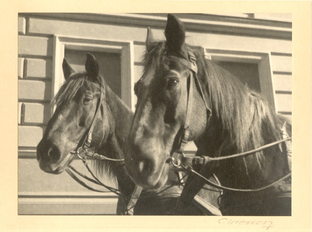 Fotografi taget av och undertecknat av Sture Claesson som avbildar två hästar som till synes verkar dra en vagn eller dylikt utanför bilden, Sture Claesson var ofta på mässor så bilden är troligen tagen i anknytning till en sådan resa. Bilden är tagen någon gång på 1900-talet.
