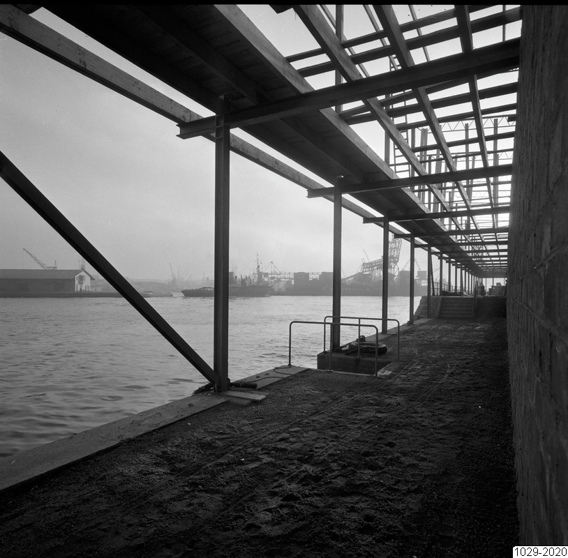 Bilden föreställer en husfasad till höger, hamnen till vänster och i fögrunden en promenad på väg att förses med tak.