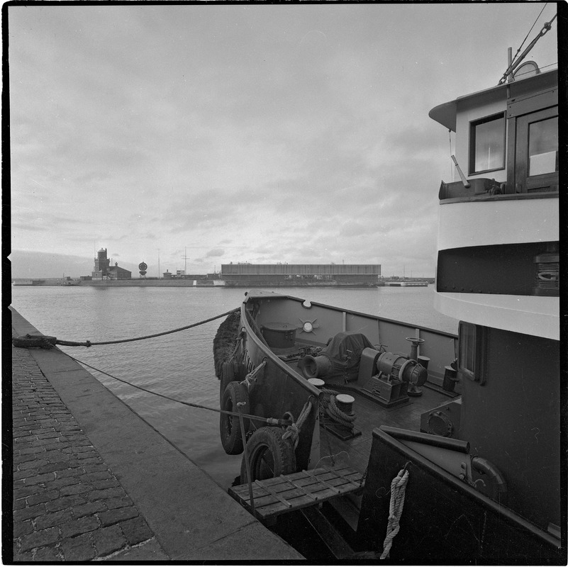 Bilden föreställer en kajkant och fören på en förtöjd båt. I balkgrunden hamn, byggnad och fyr.