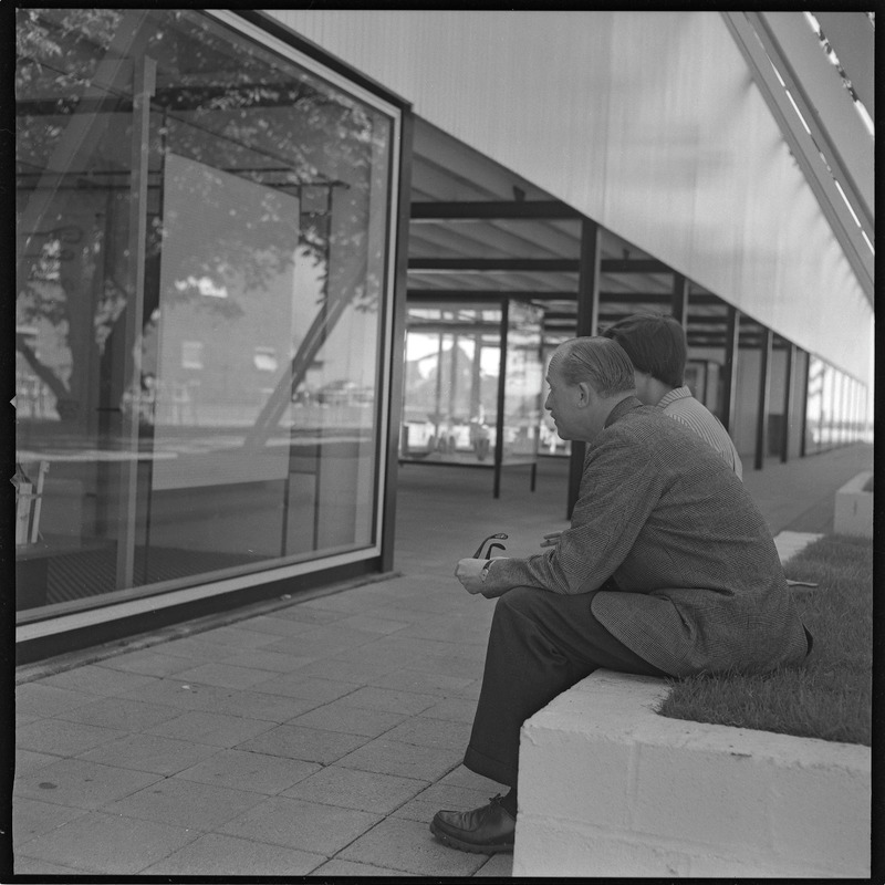 Bilden föreställer två personer som sitter på en låg mur. Till höger en paviljong och däremellan en gångbana.