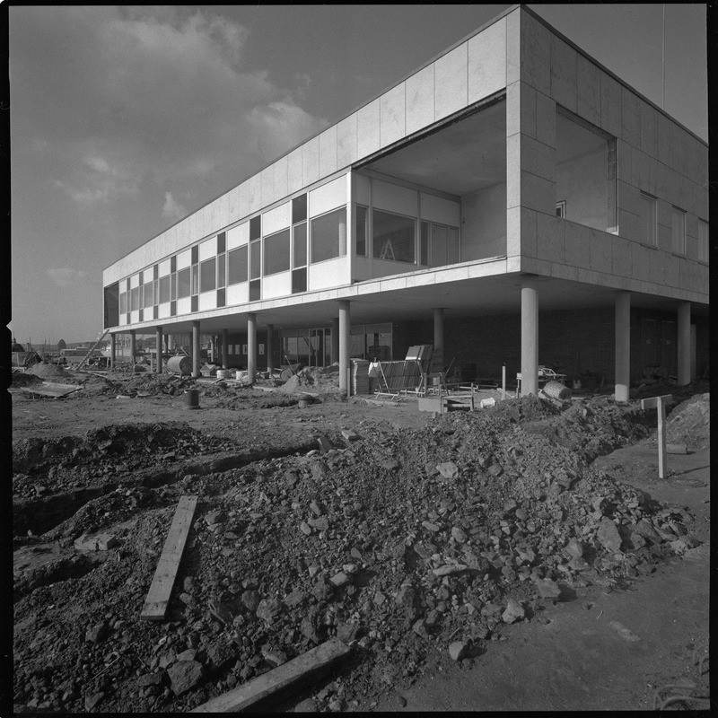 Bilden föreställer en öppen yta där det pågår markarbete. I bakgrunden paviljong.