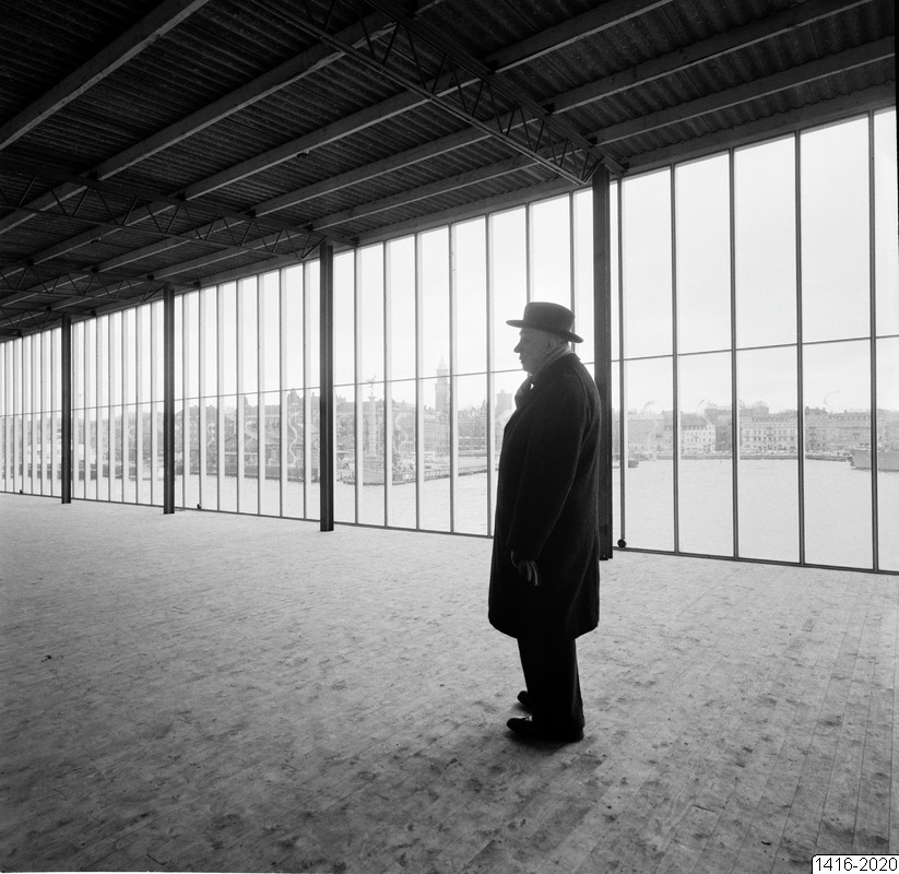 Bilden föreställer insidan på en paviljong utan inredning. I bakgrunden glasfasad. Mitt i bild man iklädd rock och hatt.
