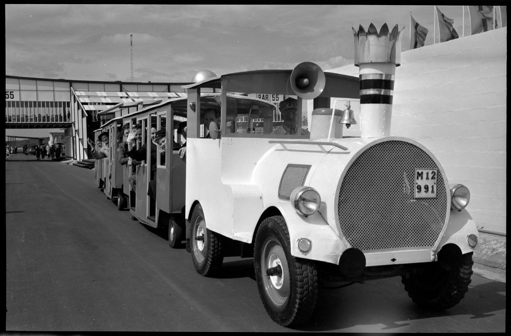 Bilden föreställer ett tåg på hjul med fullt av passagerare. I bakgrunden utställningsområdet.
