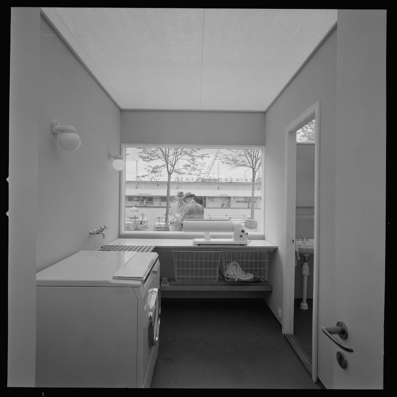 Bilden föreställer en tvättstuga. I förgrunden en tvättmaskin och i bakgrunden en bänk med tråcbackar under och ett fönster över.