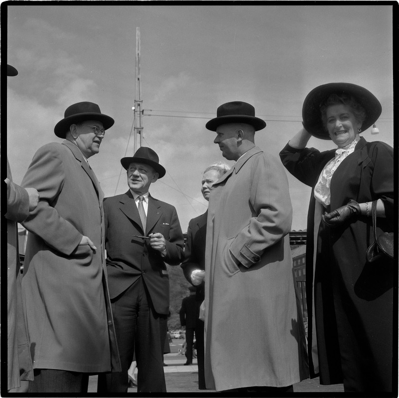 Bilden föreställer tre herrar i hatt samt en kvinna i hatt alla i trekvartsfigur.
