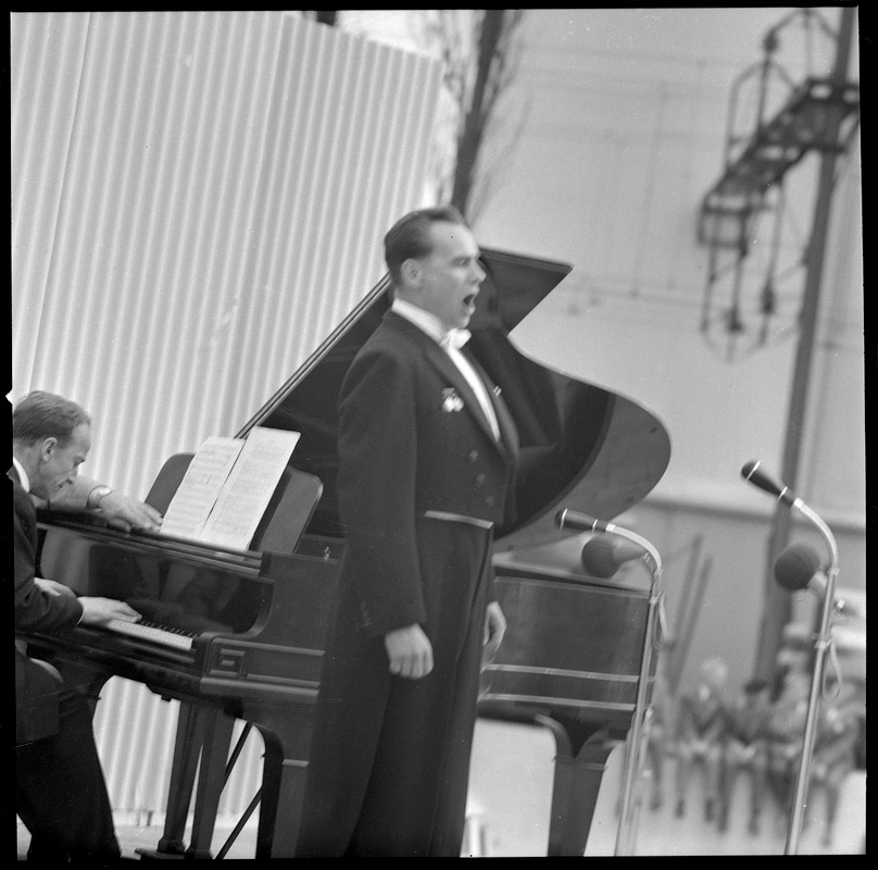 Bilden föreställer en man i frack, troligen sångare, mikrofoner. I bakgrunden flygel med painist.