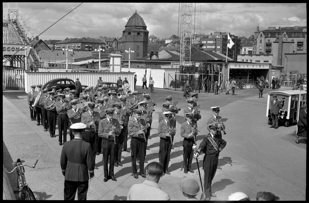 Bilden föreställer en musikkårs parad på utställningsområdet. De har blås instrument. I bakgrunden utställningsområde.