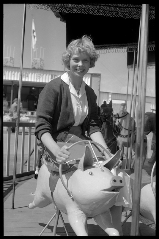 Bilden föreställer en kvinna sittande på en gris i en karusell, i bakgrunden hästar.